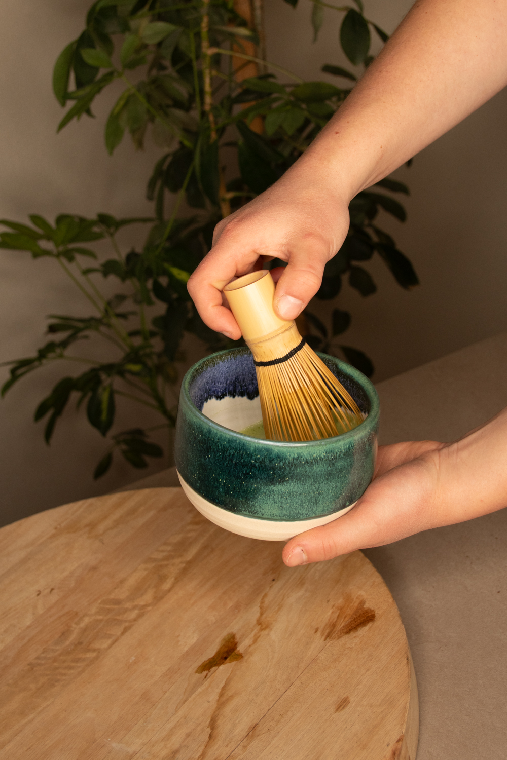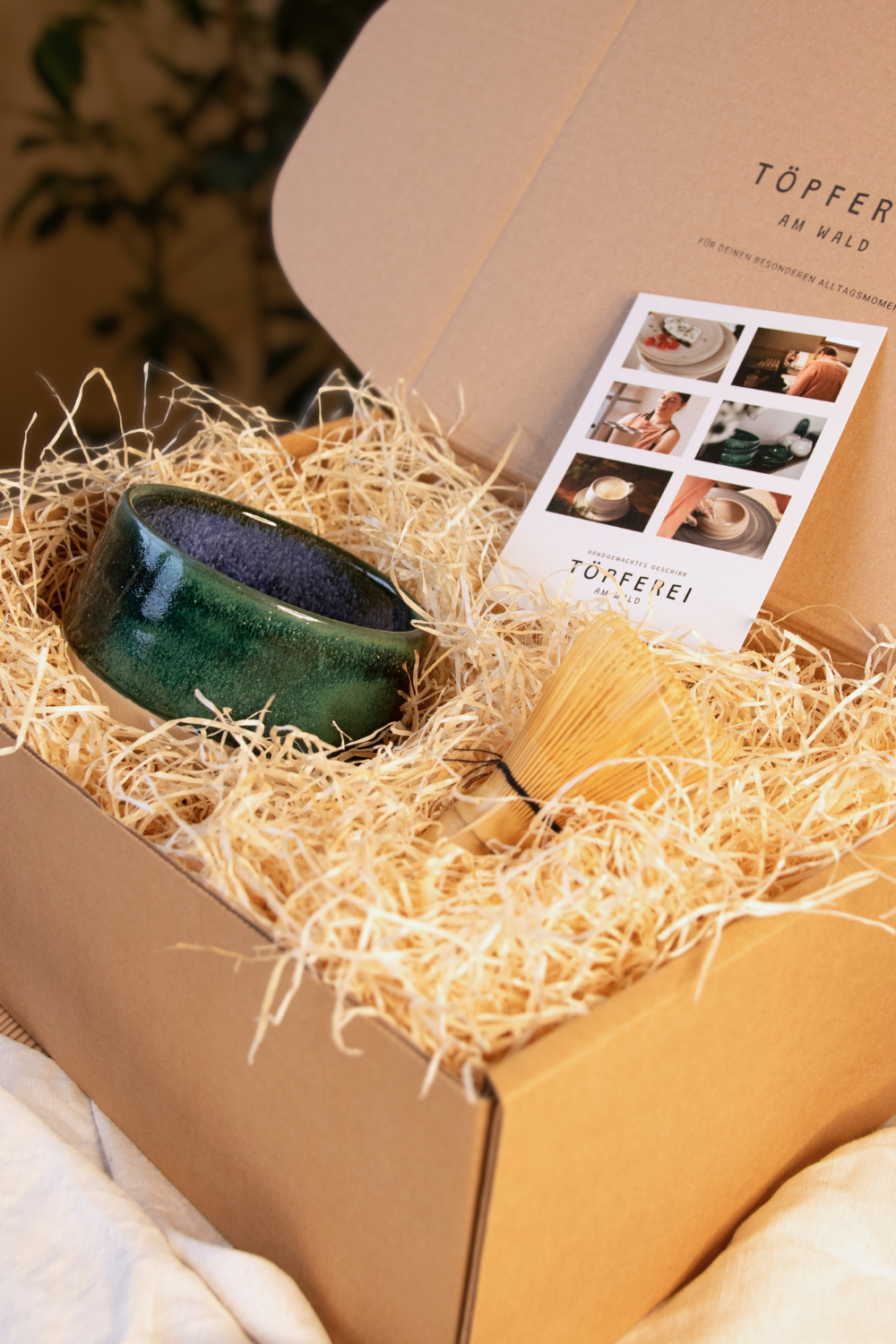 In jedem Set ist eine handgetöpferte Schale und ein Chasen (Matchabesen) enthalten.
