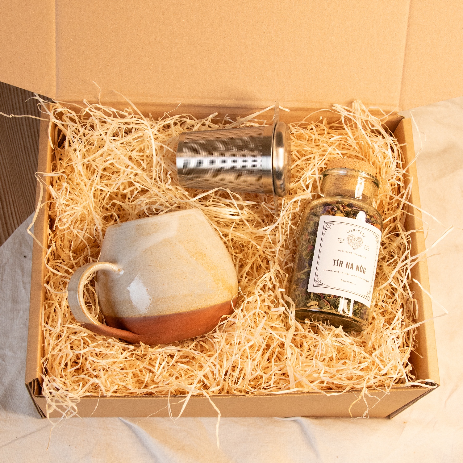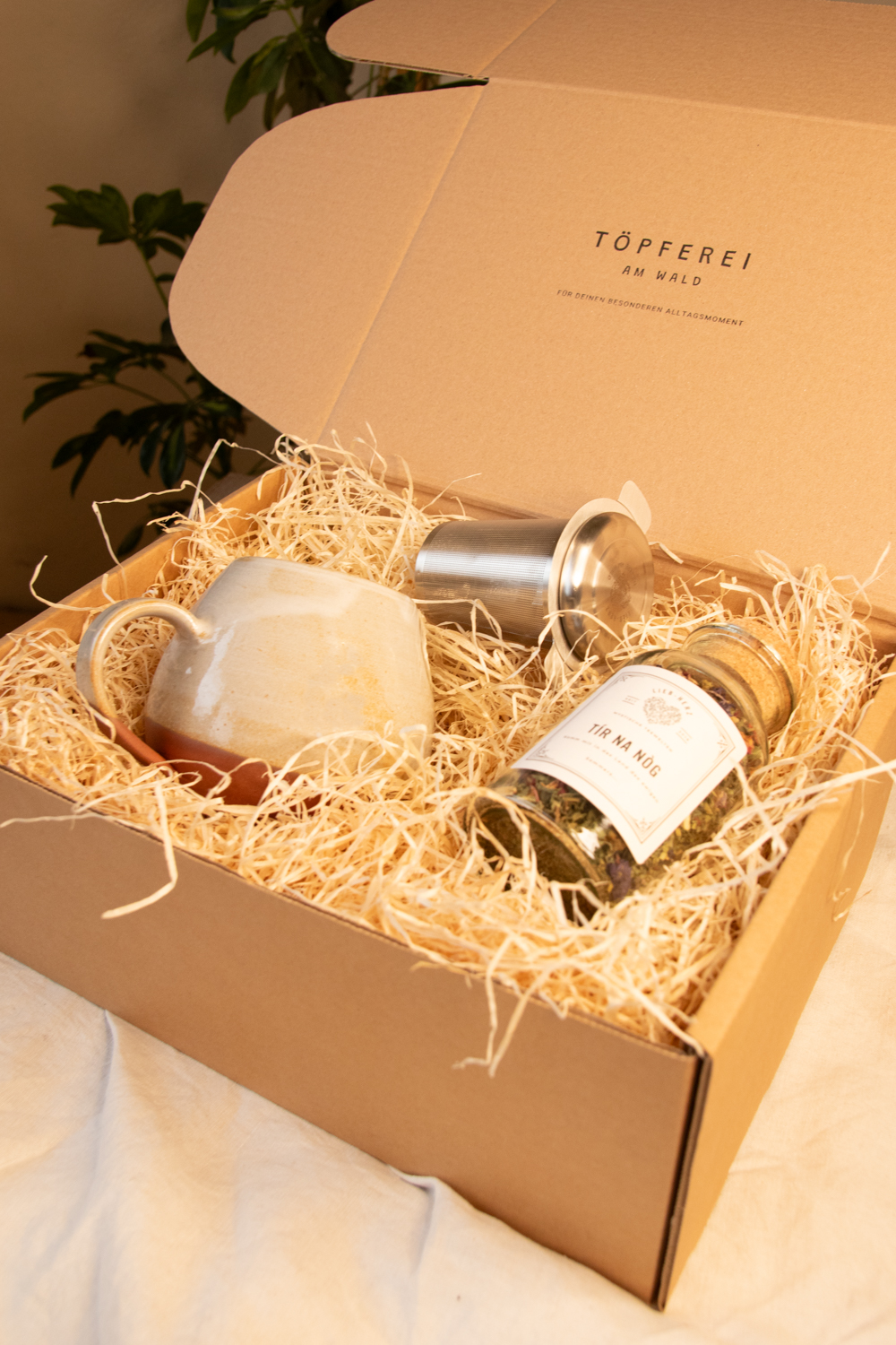 Ich verpacke jedes Set liebevoll und aufwendig in einer maßgefertigten Geschenkbox, mit Holzwolle, Jutegarn und einer Postkarte mit Infos über die Töpferei.
