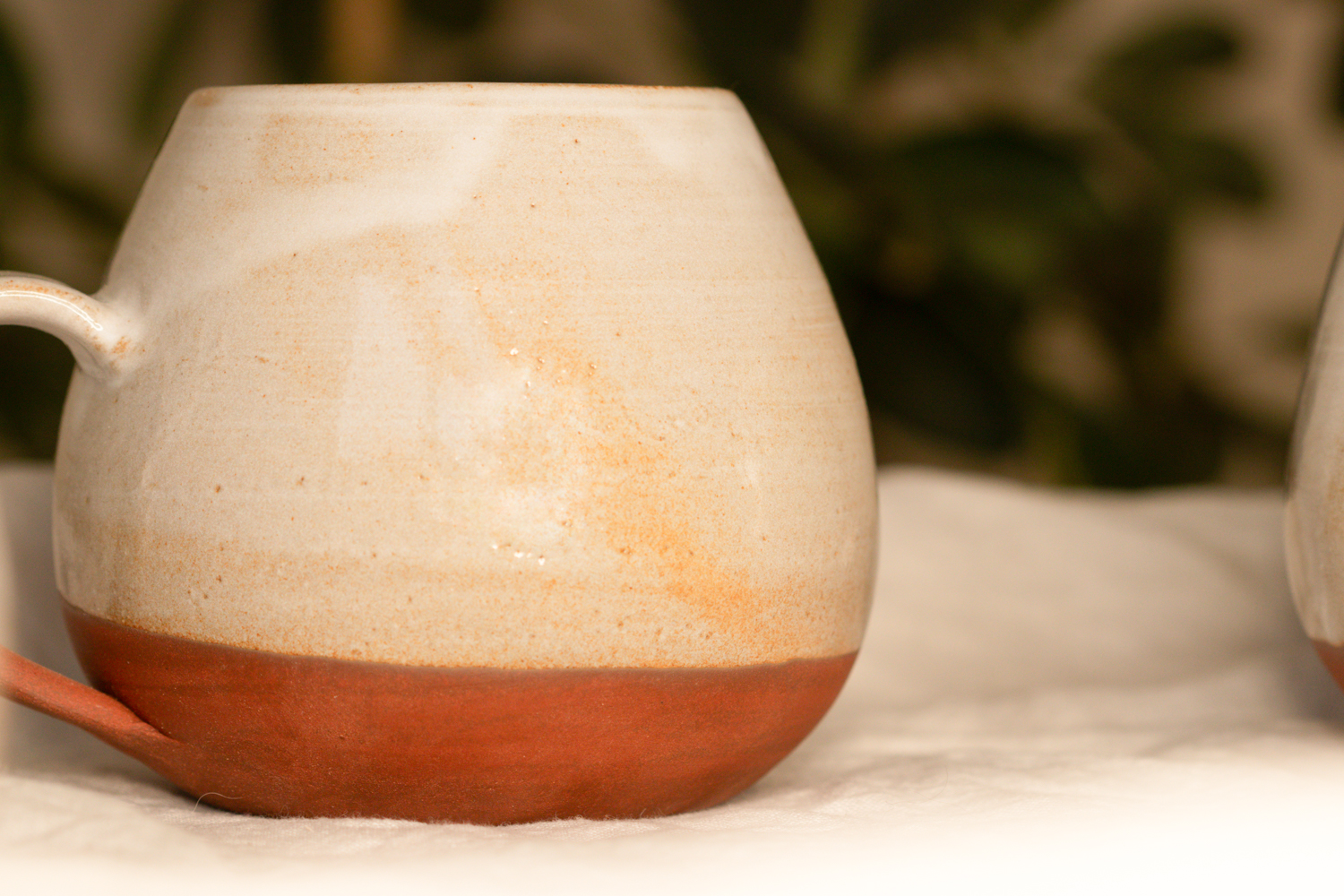 der rote Ton schimmert warm durch die halbtransparente Glasur hindurchdurch und verleiht der Tasse einen natürlichen Look