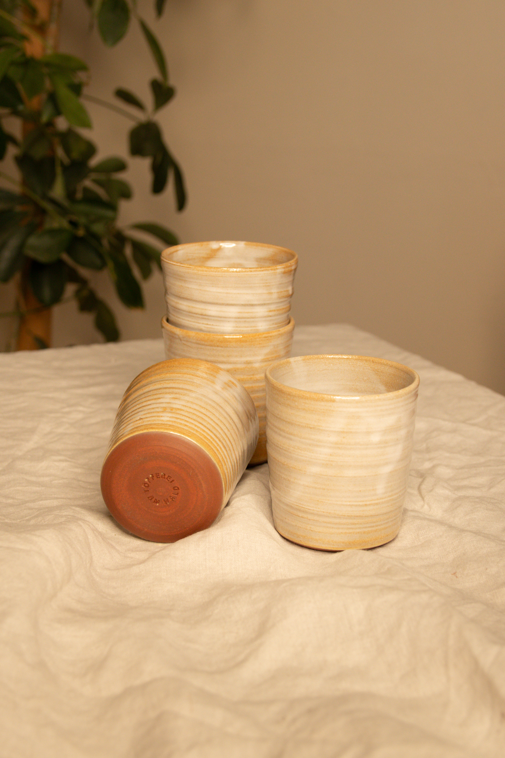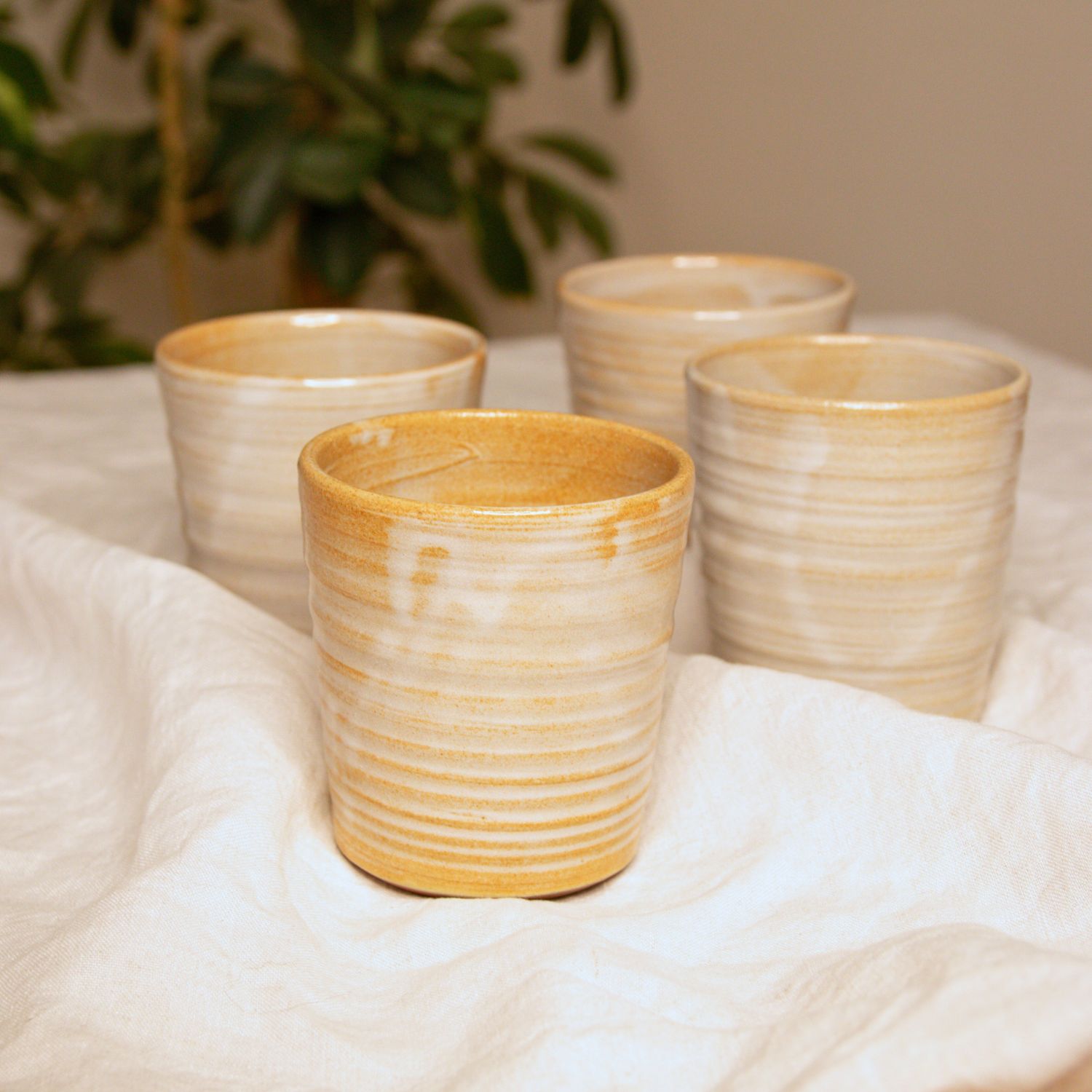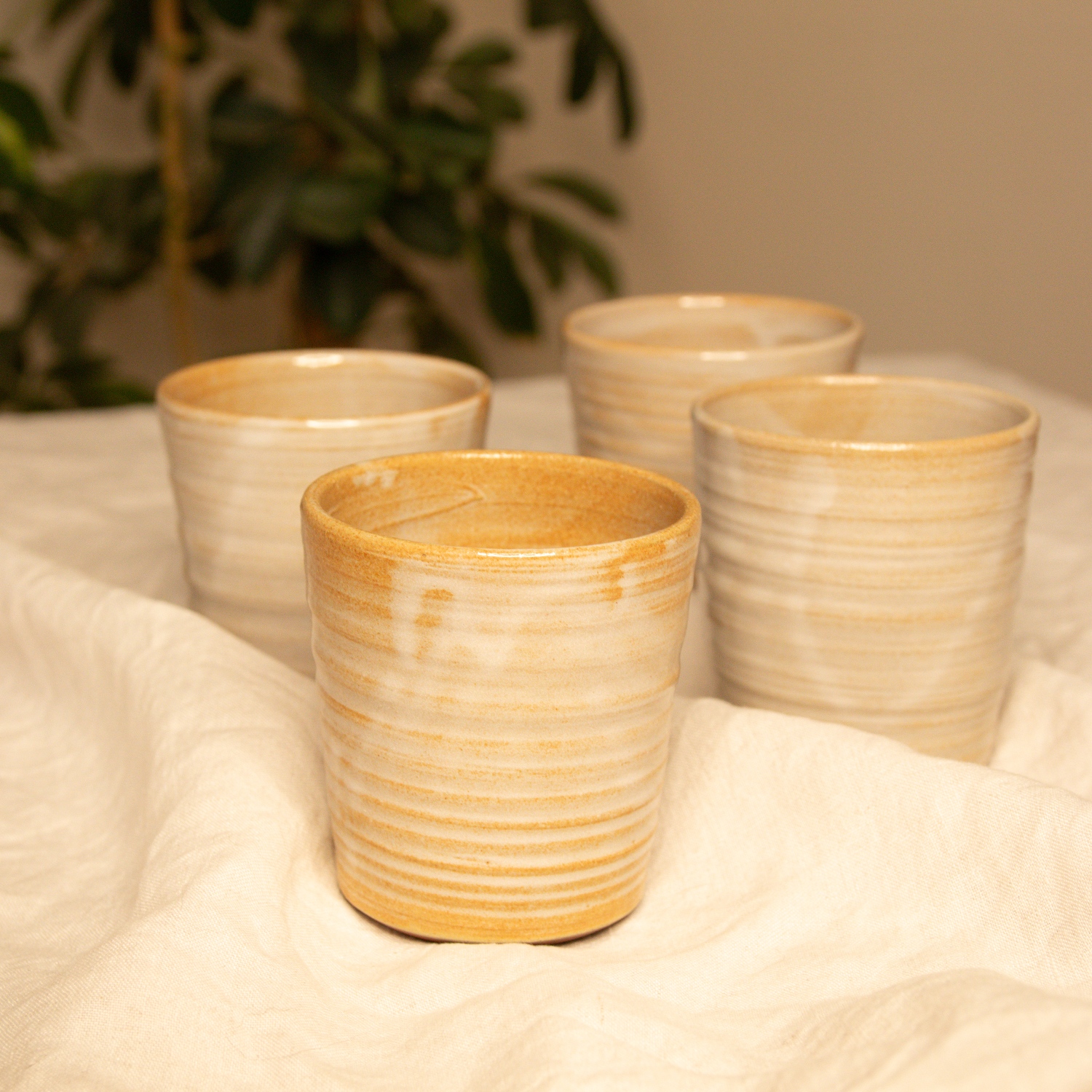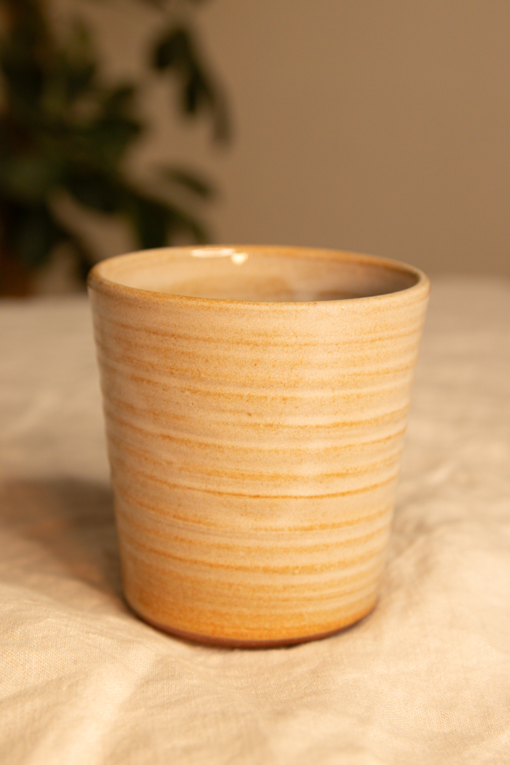 Bei diesen Bechern haben wir die Außenseite bewusst nicht geglättet, sodass die Drehspuren sichtbar sind. Das verleiht jedem Becher einen natürlichen Look und zeigt die Handarbeit, die darin steckt.