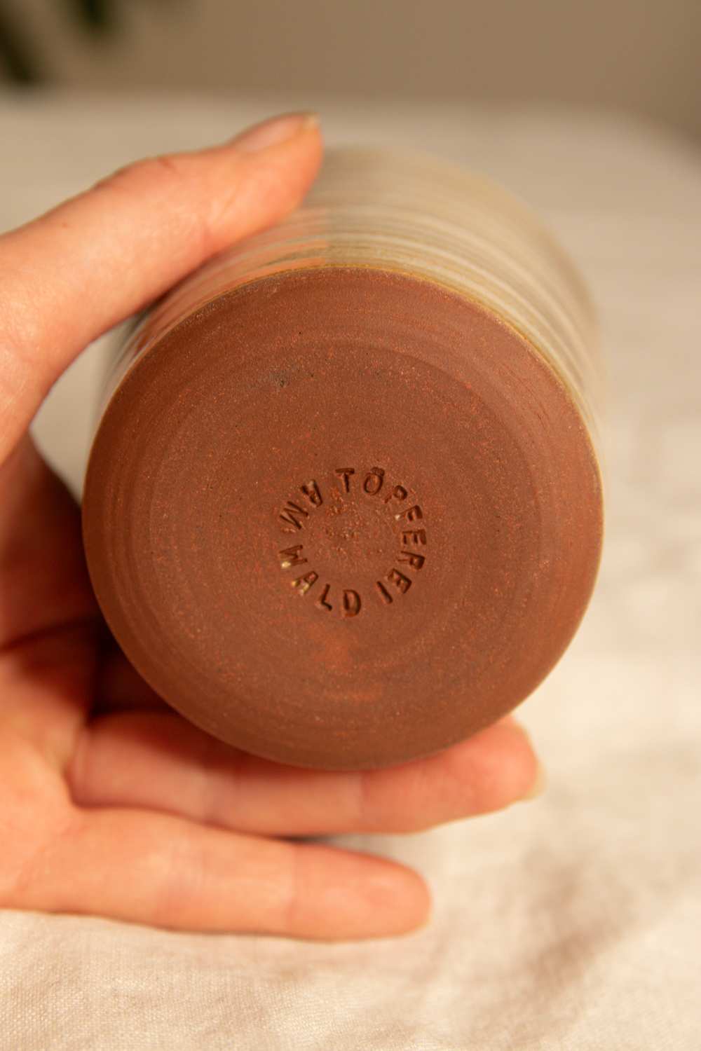 Der Becher ist spülmaschinengeeignet, mikrowellenfest, langlebig und robust. Das liegt an der hohen Brenntemperatur von 1200°C, bei der der Ton verglast.