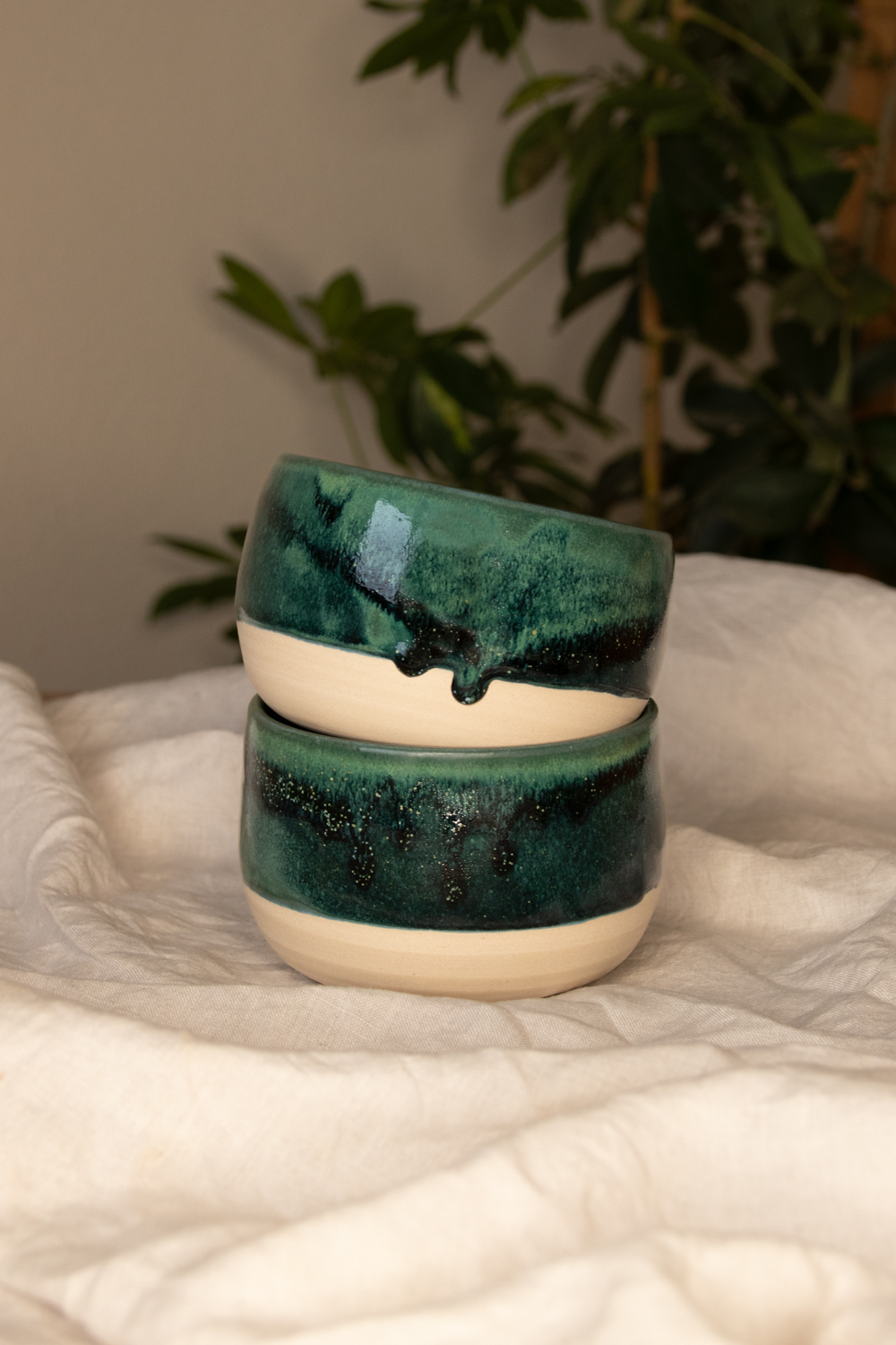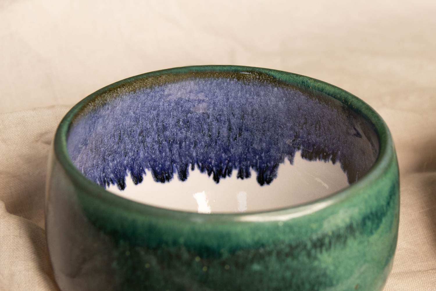 Außen "magic green" glasiert - innen weiß. Dort, wo die beiden Glasuren ineinander übergehen, entstehen spannende Farbverläufe.