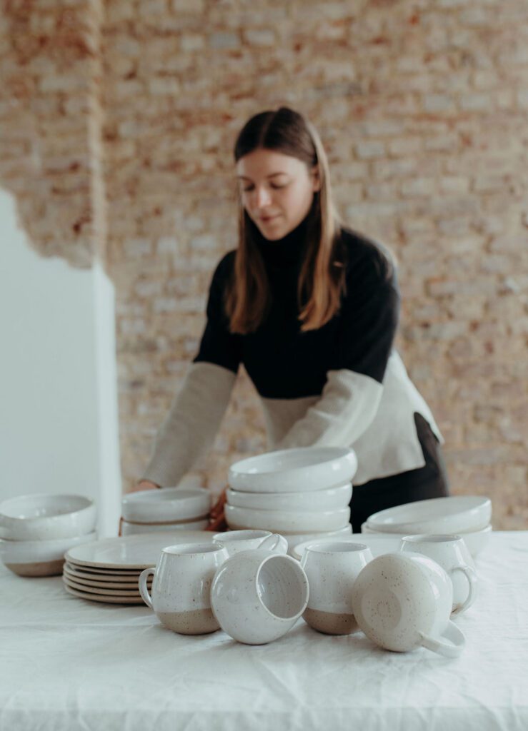 Sie ist zuständig für die Produktentwicklung und sitzt in ihrem Alltag nicht nur an der Töpferscheibe, sondern kümmert sich auch um alles, was mit dem Onlineshop und Kundenkommunikation zu tun hat.